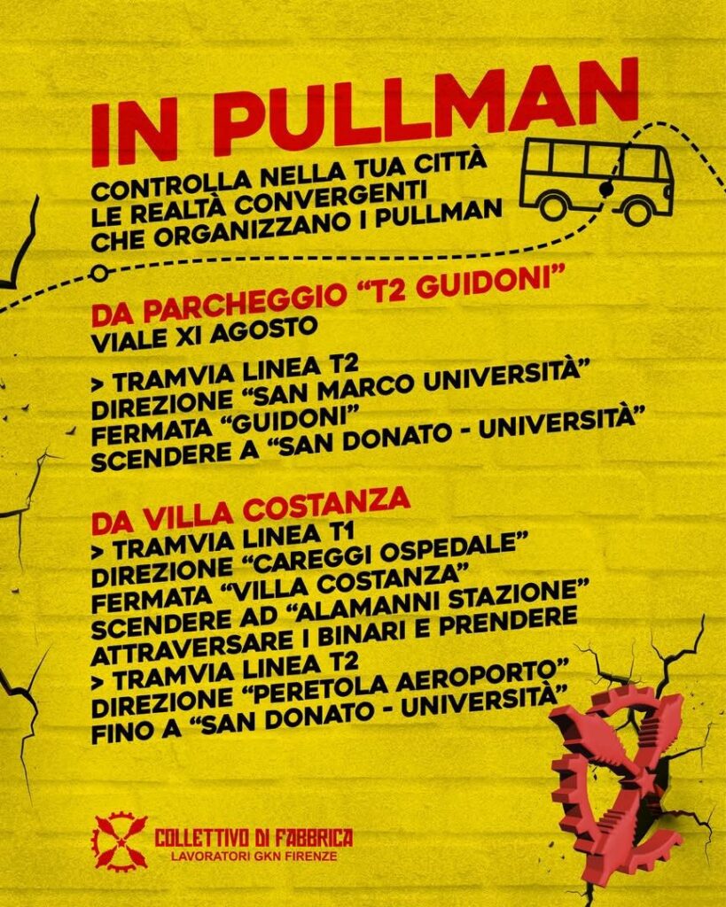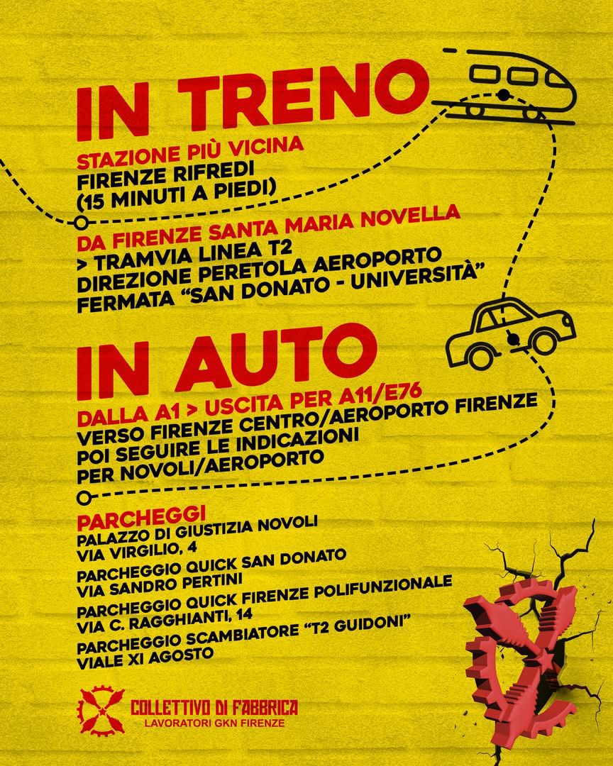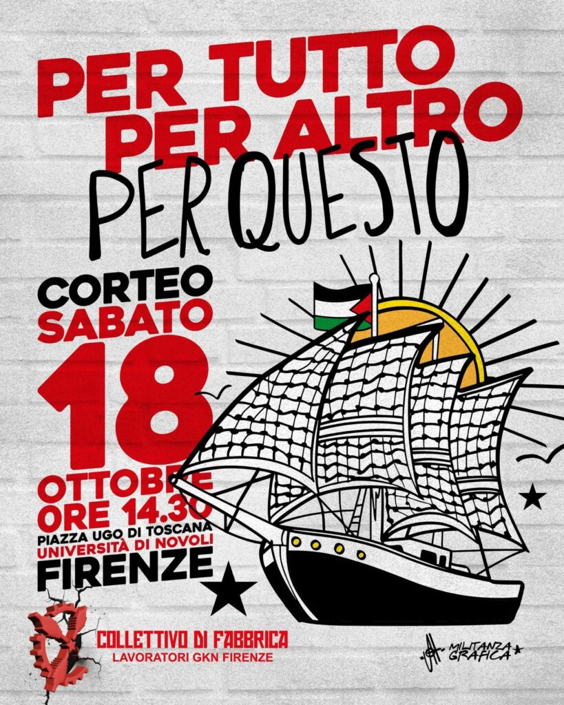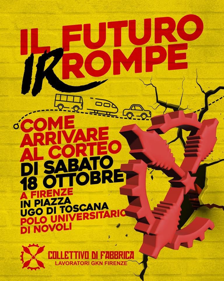 sabato 18 ottobre dalle 14.30 corteo a Firenze (concentramento in piazza Ugo di Toscana, all’interno dell’Università di Novoli) e poi domenica 19 ottobre dalle 10 alle 16 al presidio ex Gkn di Campi Bisenzio, per una giornata di convergenza con le comunità energetiche, potenziali clienti del piano industriale della ex Gkn.